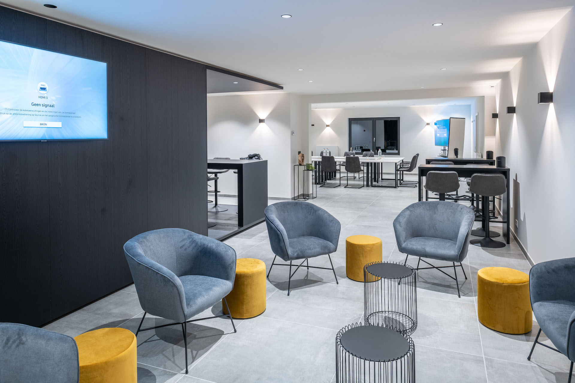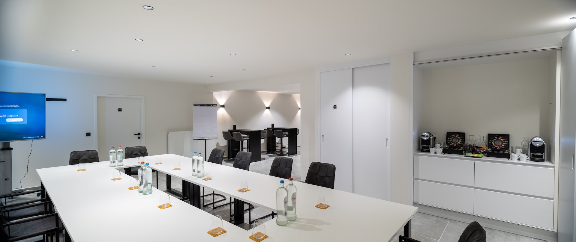 Flipchart, WIFI voor iedereen, projectiescherm in het vergader- en loungegedeelte, magnetische strips om uw notities op te hangen… Al deze zaken zijn standaard bij uw reservatie voorzien.